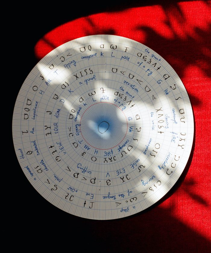 Cette composition sonore a été créée à partir des 4 partitions circulaires contenant des séquences aléatoires de l’alphabet de Alexander Melville Bell. On entend un mélange des sons verbaux et non verbaux, humains et non humains, tels que le mépris, l’agacement, la douleur, le sciage du bois ou le grognement d’un cochon – qui ont été interprétés par des artistes qui travaillent avec la voix : camille gérenton, Simone Basani, Barry Fitzgerald, Myriam Van Imschoot et Marcus Bergner.