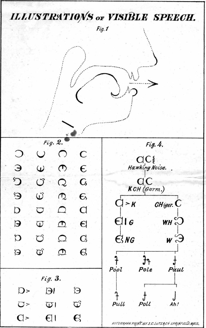 En 1867, Alexander Melville Bell publie son Visible Speech, un alphabet phonétique visuel décrivant la position des lèvres, de la gorge et de la langue lors de la production de la parole, destiné à l’origine à aider les personnes sourdes à articuler le langage.